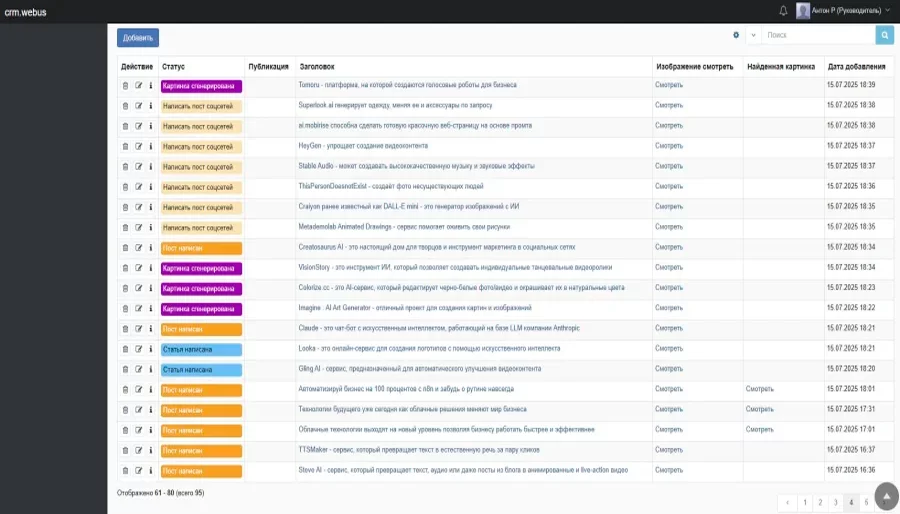 - Просмотр и правка сгенерированных постов, статей, промтов изображений (через интерфейс CRM в статусах ... готово).