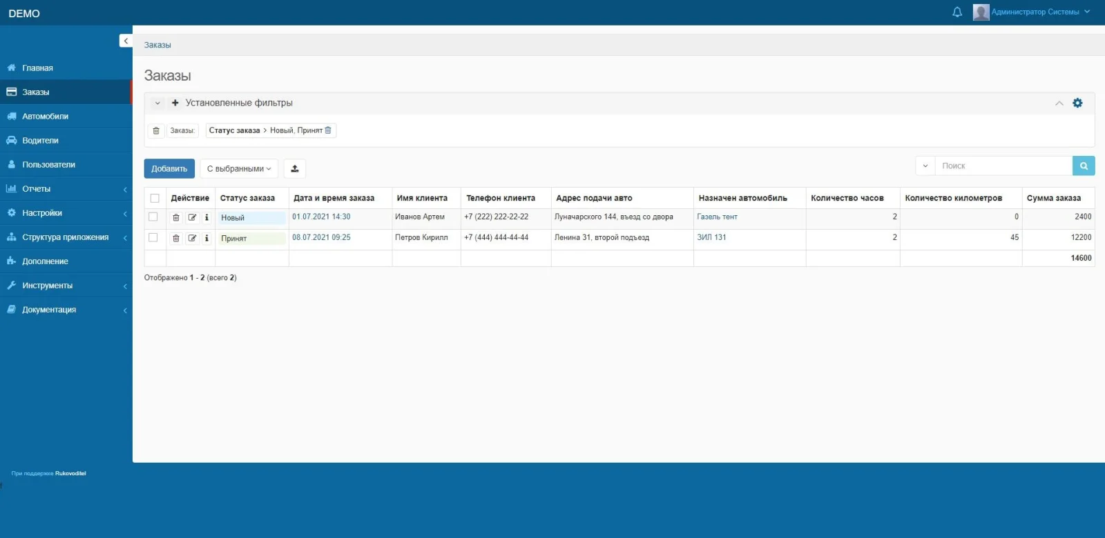 - Количество часов заказа автомобиля