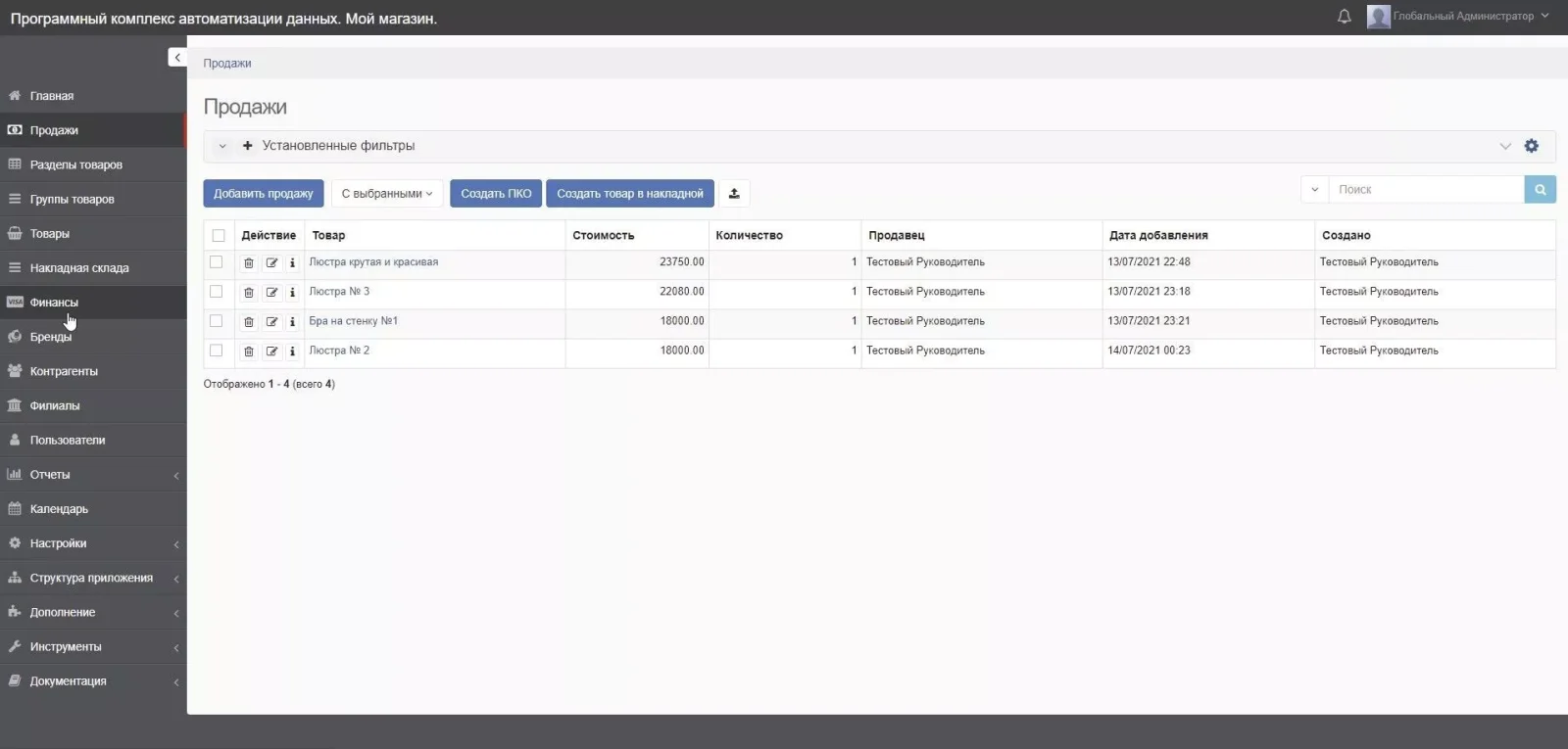 - На главной странице выводятся разные виды отчетов в соответствии с группой доступа. Это могут быть Продажи за месяц, Продажи за сегодня, и другие.