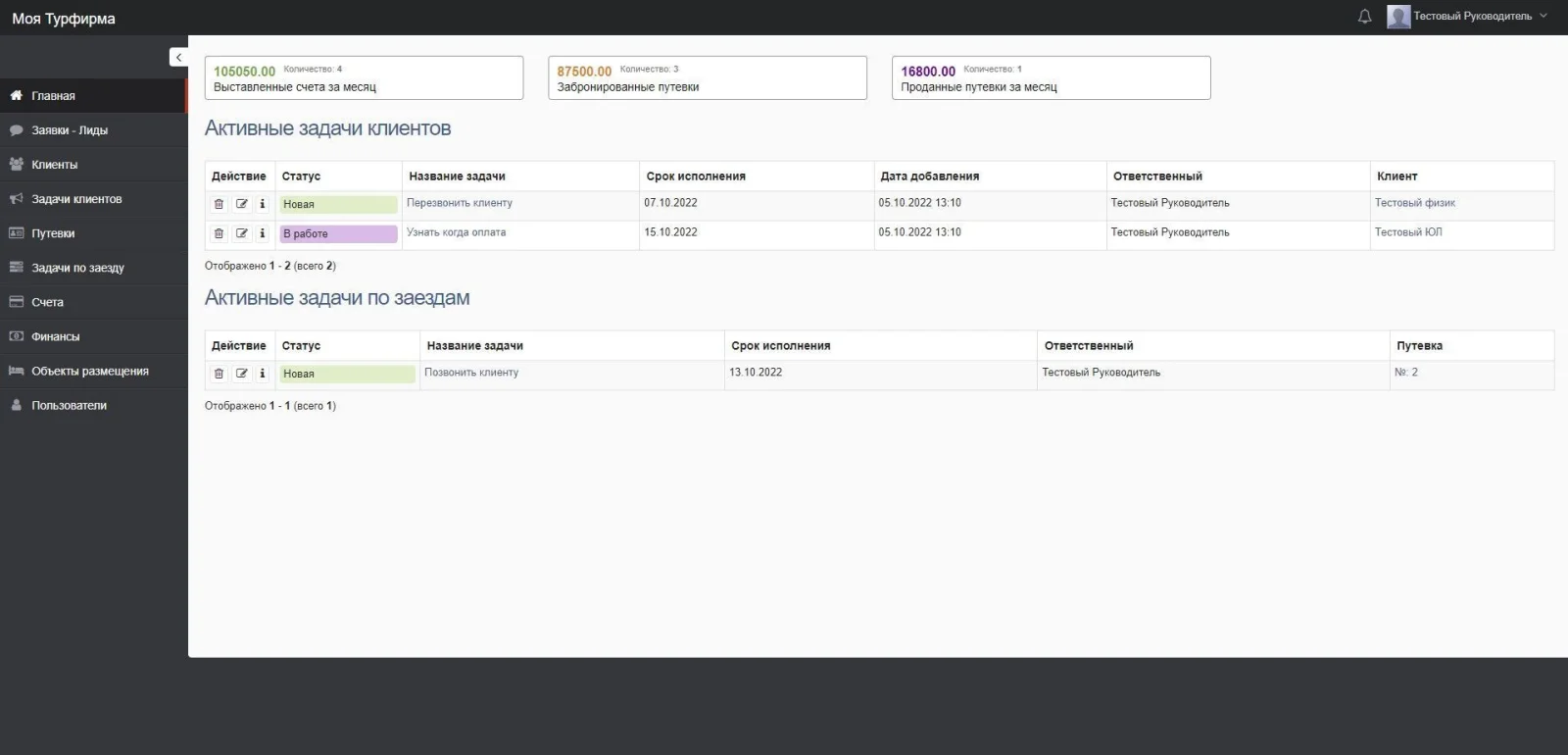 Для каждого заезда реализованы Задачи по заезду для напоминания менеджерам.