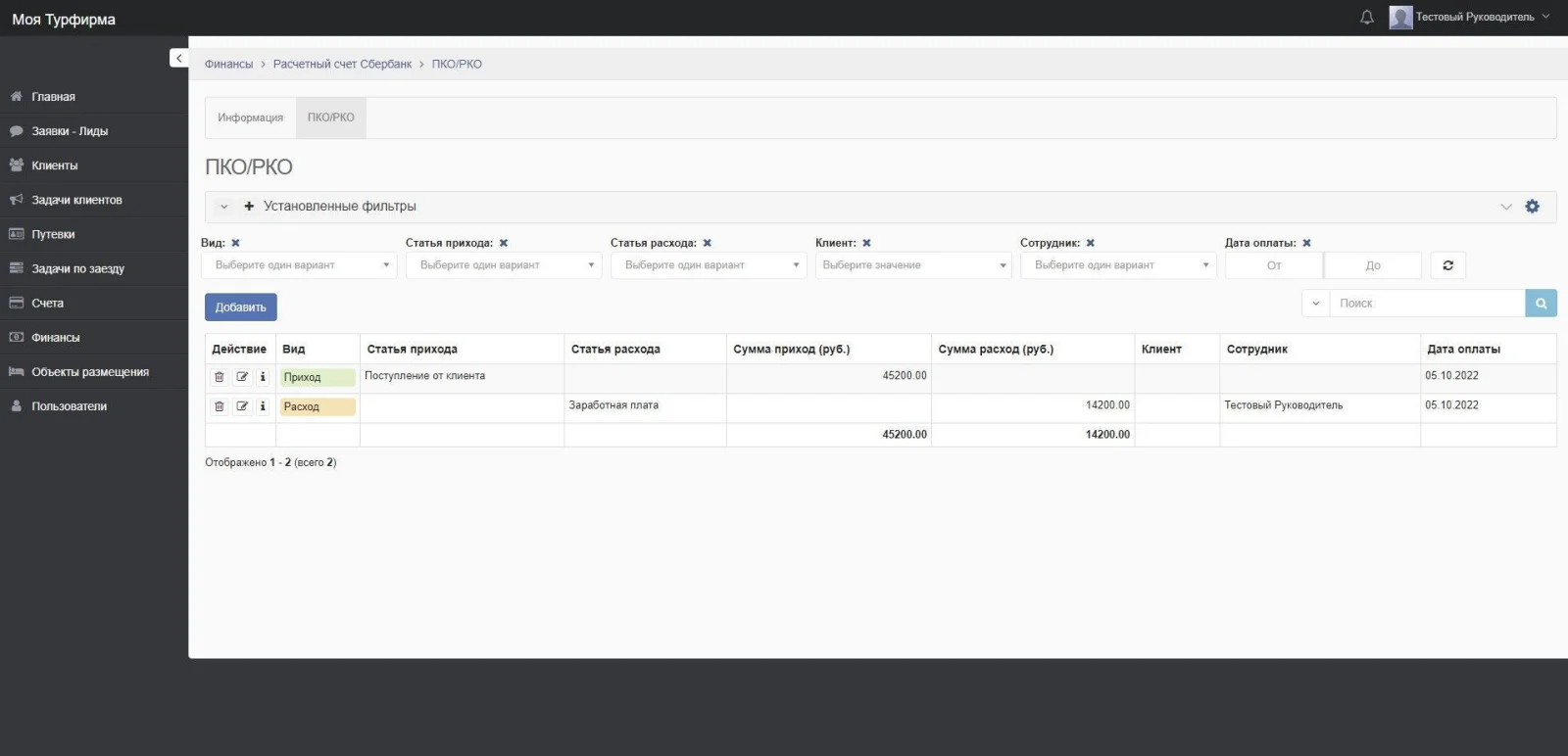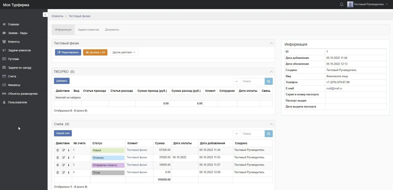 Функционал выставления счетов клиентам за путевки.