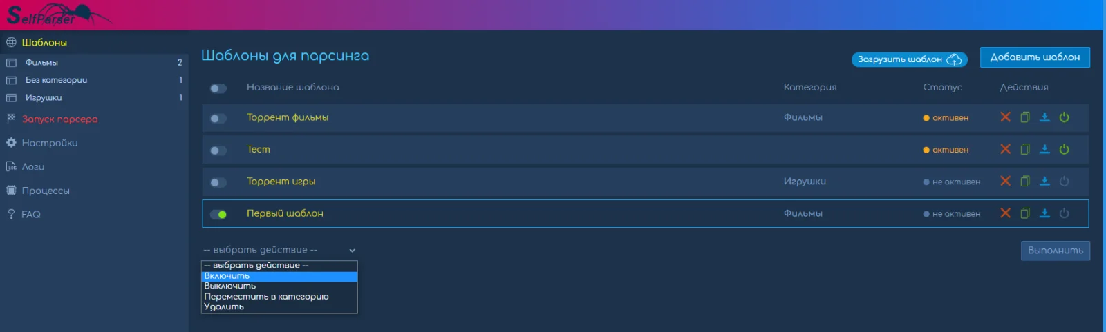• Копировать шаблоны, загружать шаблоны для парсинга.