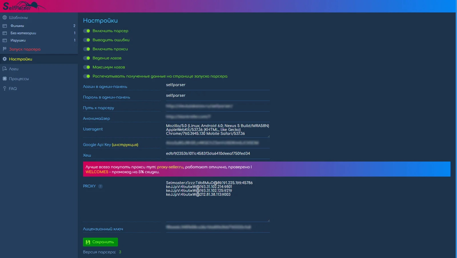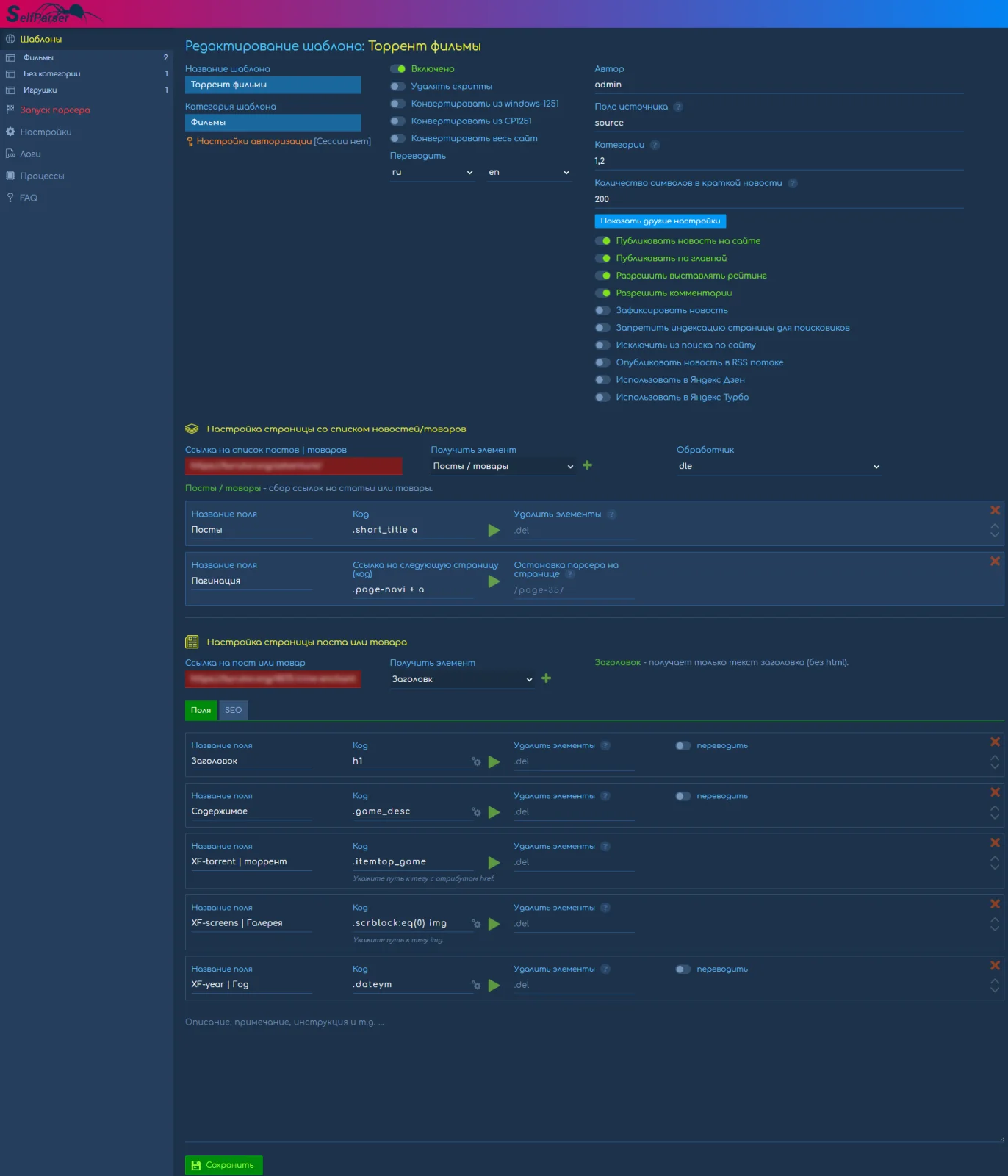 В комплект включен пример шаблона парсинга новостей с официального сайта CMS DataLife Engine для примера настроек.