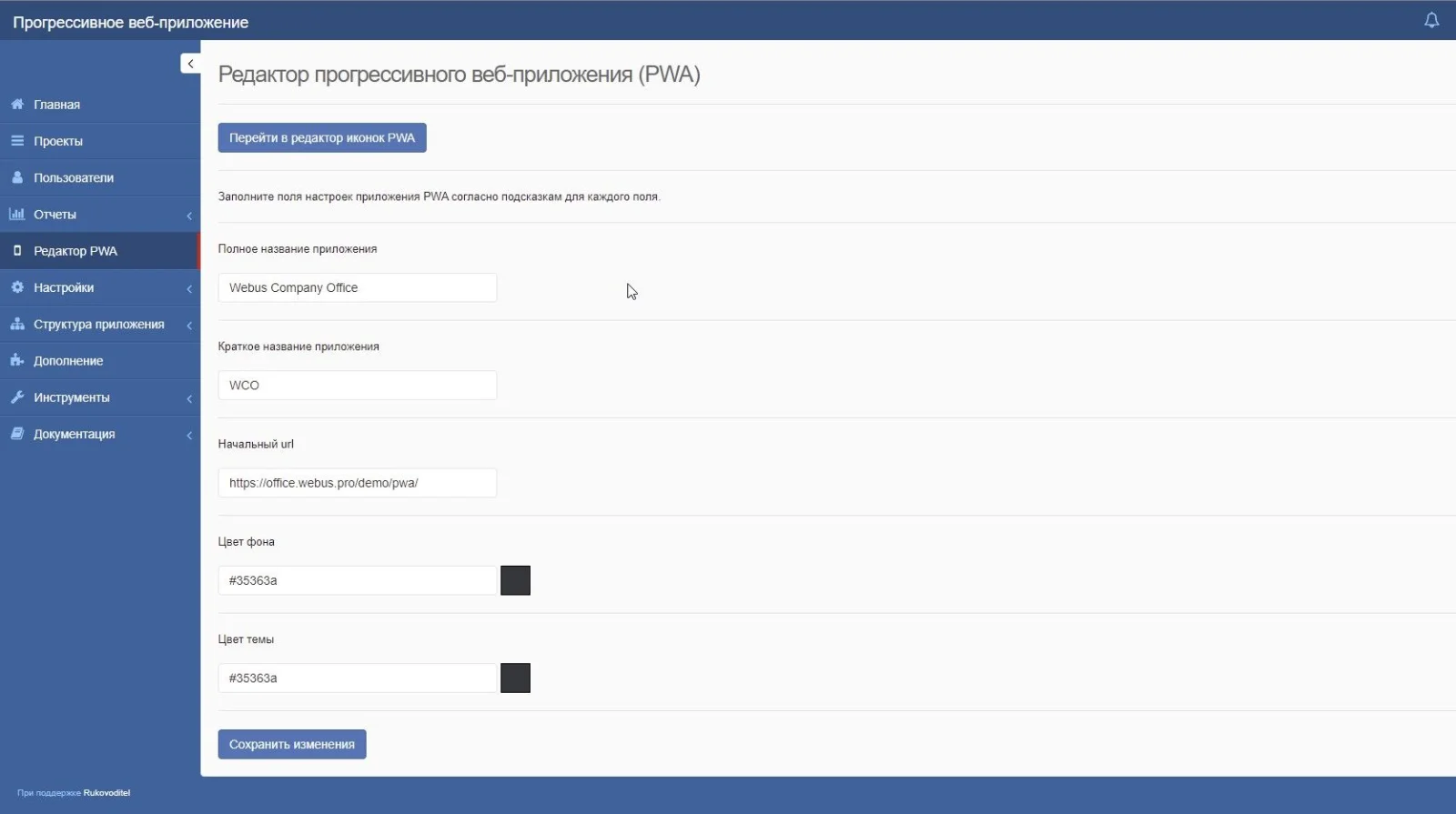 - Настраивать полное название, краткое название, цветовую схему, начальный путь загрузки приложения.