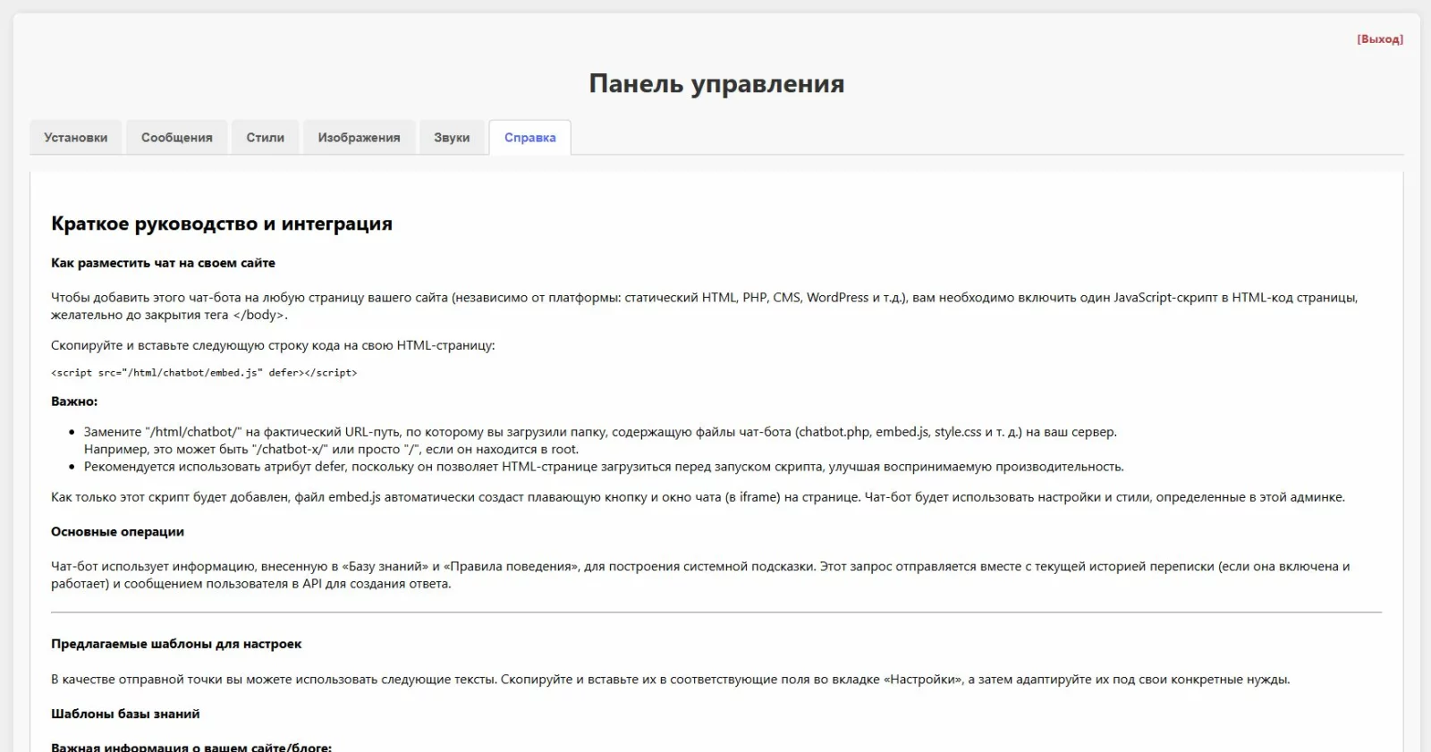 - Поддержка Markdown: Сообщения бота отрисовываются из Markdown в HTML (поддерживается жирный шрифт, курсив, списки, ссылки, блоки кода).