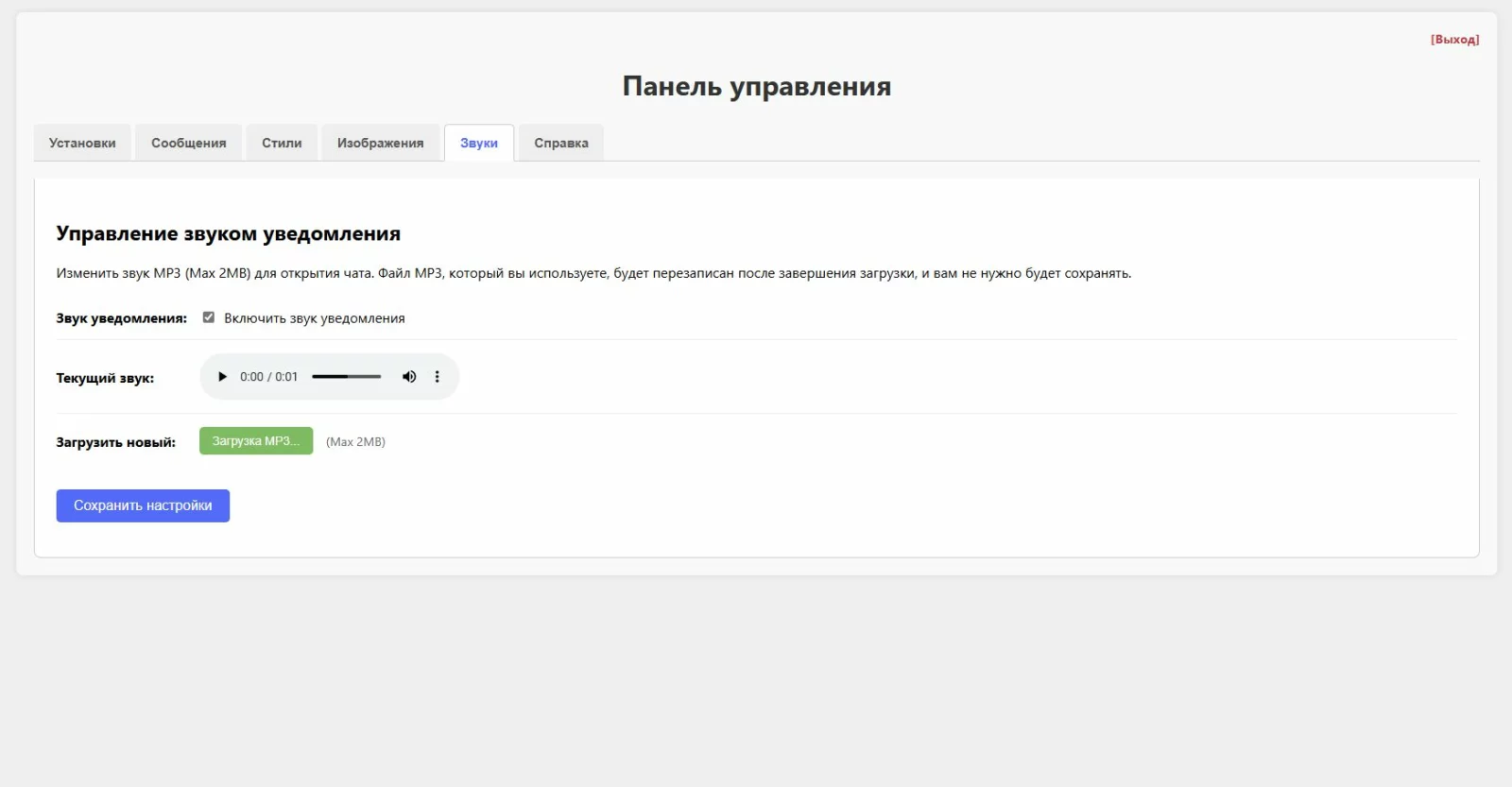 - Звук уведомления: Воспроизводит звук при открытии чата (может быть настроен и отключен).