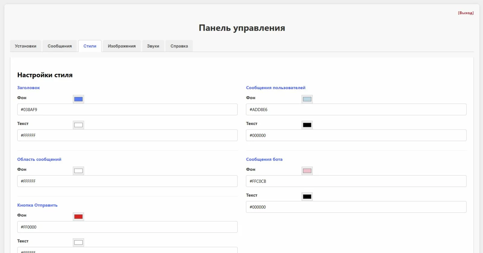 - Пользовательские цвета для различных элементов чата (настраиваются через панель администратора).