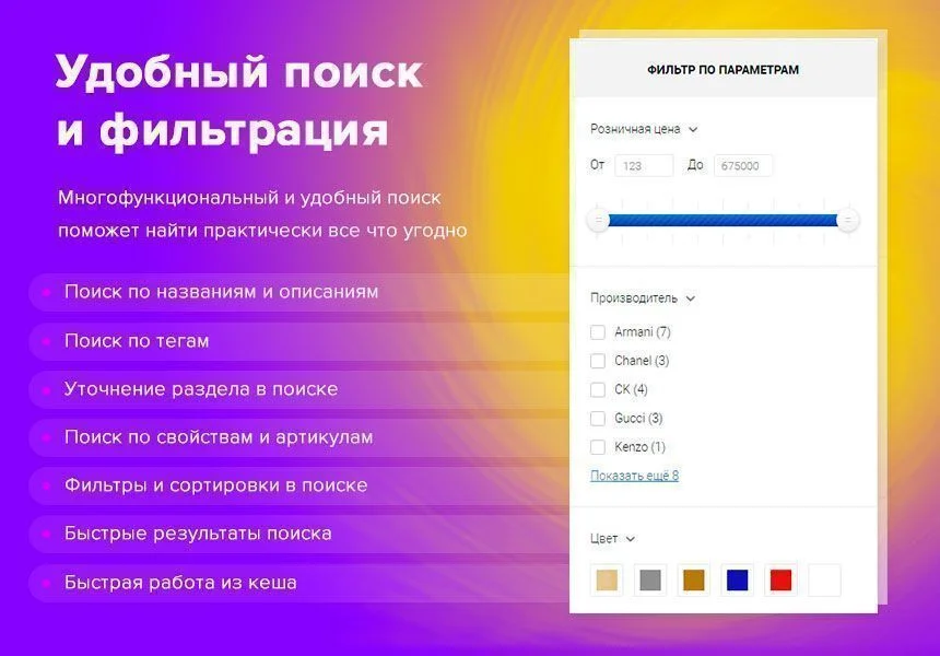 Технически конверсию магазина нельзя перечислить списком как функции, но мы предлагаем Вам изучить наш магазин с точки зрения покупателя, и убедиться насколько удобно, доступно и ненавязчиво расположены нужные функции, что самое необходимое всегда под рукой и в нужном месте! При заходе на хороший, удобный интернет магазин, у Вас должно быть 3 ощущения: